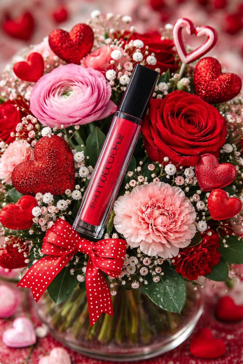 Offrez une attention unique alliant fleurs et beauté. Ce bouquet est accompagné d’un rouge à lèvres liquide mat, à la longue tenue, disponible en plusieurs teintes au choix.